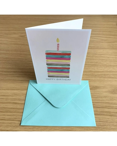 Beautiful watercolour Happy Birthday Card. Our 5.75” x 4.25” cards are printed on 300gsm cardstock. They’re glossy on the outside, matte white and non-bleed inside. You can write on them with any pen! The set also comes with 120gsm mint colored envelope.