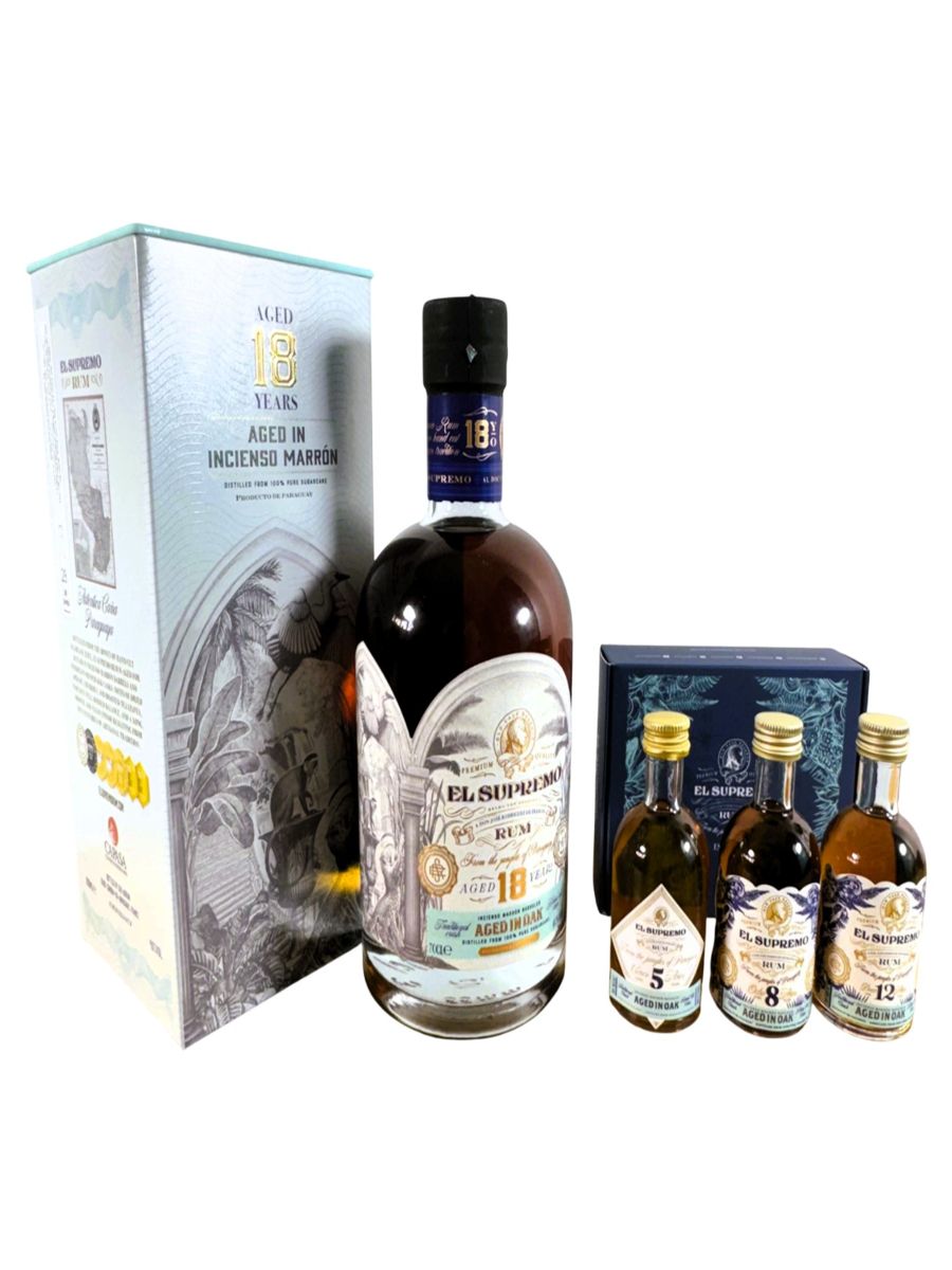 Get a set FREE miniature gift set of the 5, 8 and 12 years El Supremo Rum, valued at £20, with each bottle of El Supremo 18Years Old purchased