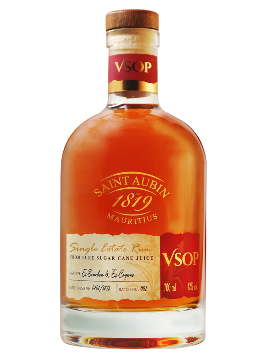 From the St Aubin Premium Selection in Mauritius. This rum is made from the pure pot distilled sugar can juice. The VSOP is a blend of rums matured in ex-bourbon and ex-cognac barrels for a minimum of 4 years for bottling.